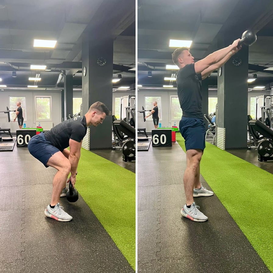 - Provedení: Stůjte na šířku ramen, držte kettlebell oběma rukama. Provádějte švihem z boků – ne rukama. Vyražte kettlebell do výšky hrudníku, poté nechte volně klesnout mezi nohy. Záda zůstávají napřímená – pohyb vychází z kyčlí.