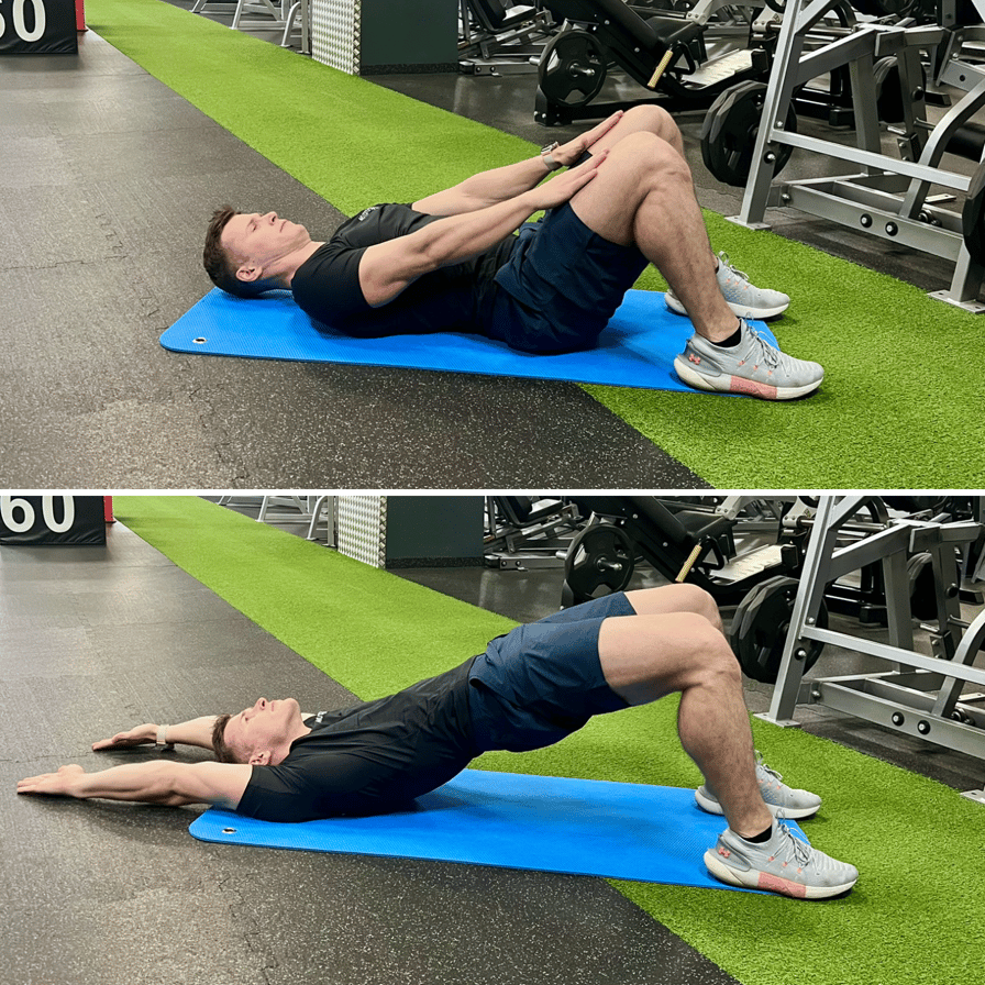 - Provedení: Lehněte si na záda, pokrčené nohy na šířku boků, chodidla celou plochou na podlaze. Zvedněte pánev vzhůru, zároveň vzpažte natažené paže nad hlavu. Poté se vraťte zpět.