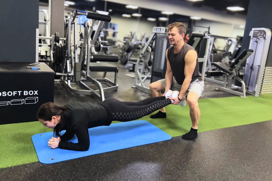 Popis cviku: Jeden se postaví do planku na loktech, druhý stojí vzadu a drží nohy v kotnících. Držící dělá dřepy v širokém postoji. Držte plank cca 30 sekund, pak se vystřídejte.