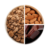 Celozrnné ovesné vločky 36 %, hrachový proteinový izolát, řepkový olej, cukr, glukózový sirup, mandle 6 %, kousky bílo-mléčné čokolády 5 % (cukr, plnotučné sušené mléko, kakaové máslo, kakaová hmota, sušená syrovátka, emulgátor slunečnicový lecitin), celozrnné pšeničné vločky, kakao, hrachová mouka, přírodní aroma. Může obsahovat stopy arašídů, sóji, jiných druhů ořechů a sezamu.