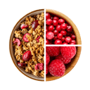 Celozrnné ovesné vločky 42 %, vláknina z kořene čekanky, hrachový proteinový izolát, řepkový olej, celozrnné pšeničné vločky, hrachová mouka, lyofilizované maliny 1,5 %, lyofilizovaná klikva 1 %, přírodní aroma. Může obsahovat stopy arašídů, sóji, mléka, ořechů a sezamu.